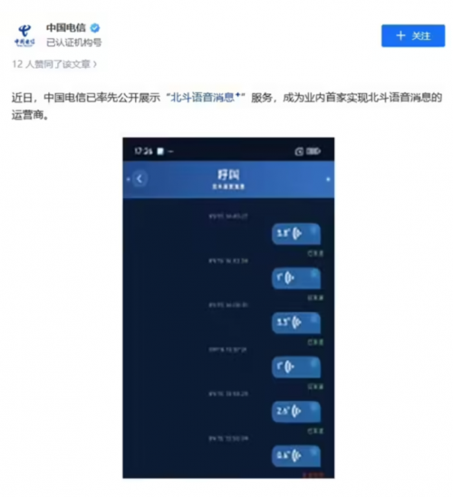 据“中国电信”机构号,其已率先公开展示“北斗语音消息”服务,成为业内首家实现北斗语音消息的运营商。