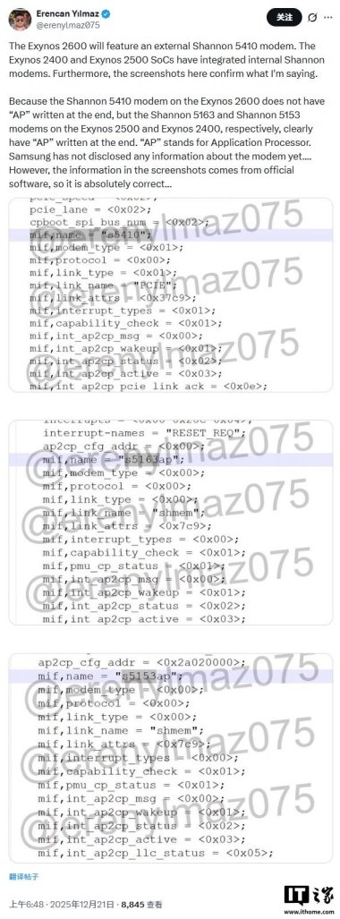 这款新型芯片同时还缺少内置的 GPS、Wi-Fi、蓝牙、超宽带(UWB)以及近场通信(NFC)功能。因此,三星必须为 Exynos 2600 搭配一款外置调制解调器和额外的连接芯片。据爆料人 @erenylmaz075 透露,Exynos 2600 将与三星一款名为 Shannon 5410 的外置调制解调器配对使用,该调制解调器或将支持 2G、3G、4G、5G 网络以及非地面网络(NTN,即卫星直连)功能。三星有望在未来几天内公布 Shannon 5410 芯片的具体功能与参数规格。